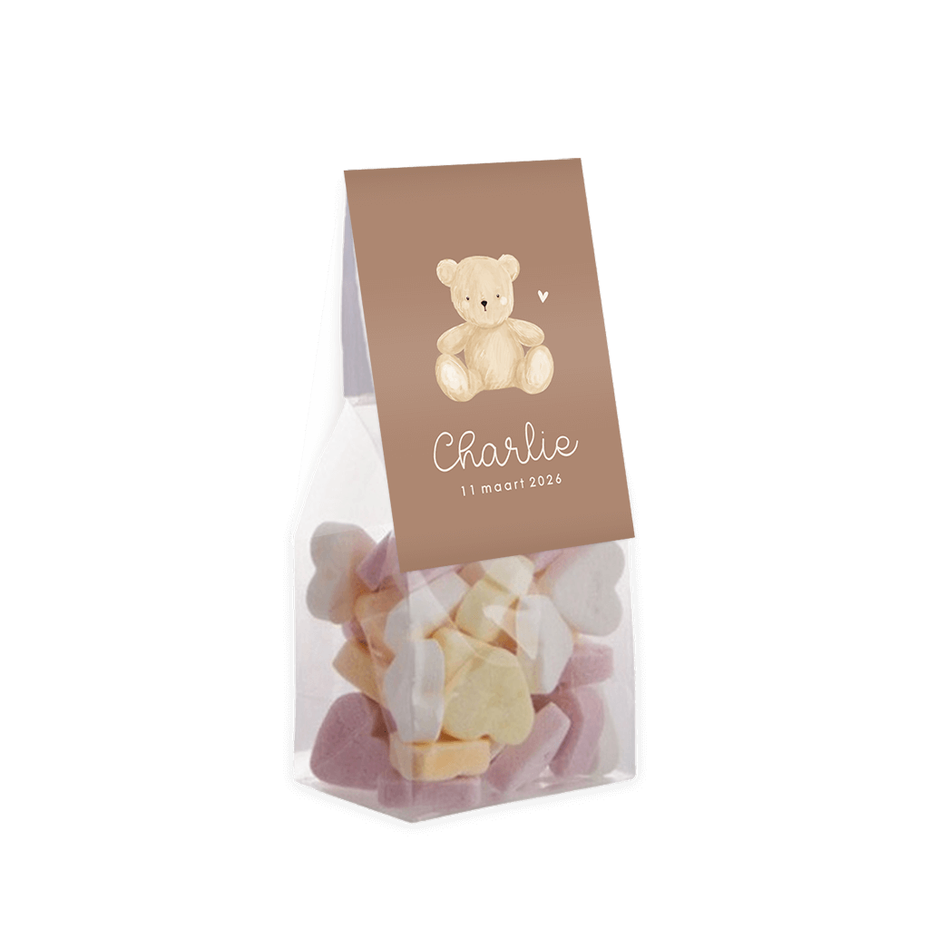 Een lief vouwkaartje met een schattig beertje op een bruine achtergrond. Dit vouwkaartje is een toffe geboorte traktatie. Bedank vrienden en familie in de stijl van je geboortekaartje voor alle warme wensen en attenties. Het vouwkaartje is 6 cm breed en 17 cm lang. Bestel meteen de zakjes mee, om de doopsuikers compleet te maken. Je hoeft enkel de snoepjes nog zelf uit te zoeken en het geheel in elkaar te zetten. Heerlijk klusje tijdens je verlof!