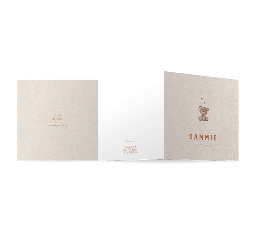 Een lief zigzag geboortekaartje voor jouw kindje. Het ontwerp heeft een beige achtergrond met daarop een lief ontwerp van een beertje. Aan de binnenkant zie je een gedichtje, de geboortegegevens en jullie gegevens. Het kaartje kan je twee keer openklappen.