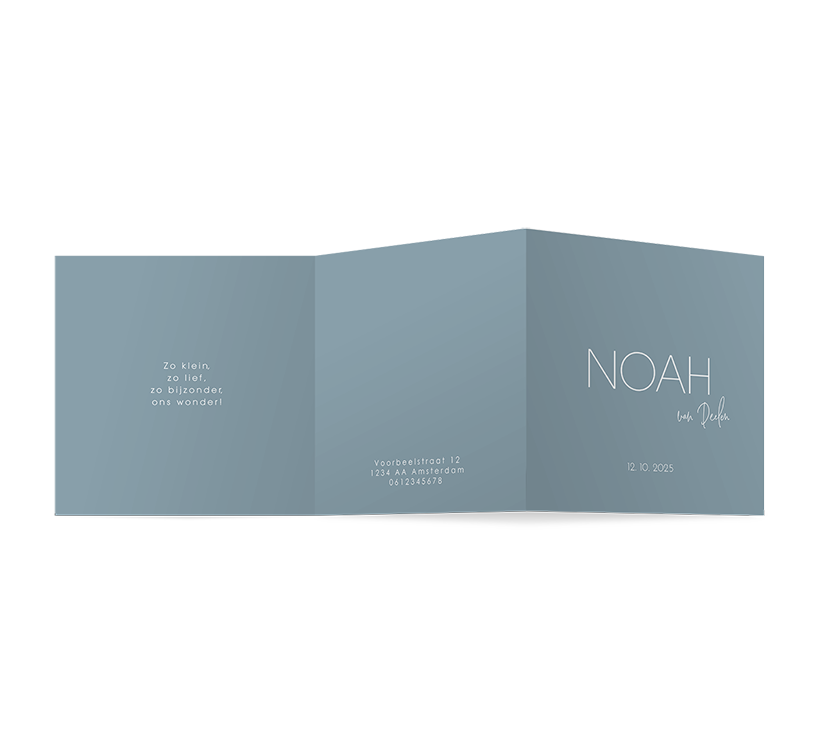 Een minimalistisch zigzag geboortekaartje voor jouw zoon. Het ontwerp heeft een stijlvol rustig ontwerp met een blauwe achtergrond. Aan de binnenkant zie je een gedichtje, de geboortegegevens en jullie gegevens. Het kaartje kan je twee keer openklappen.