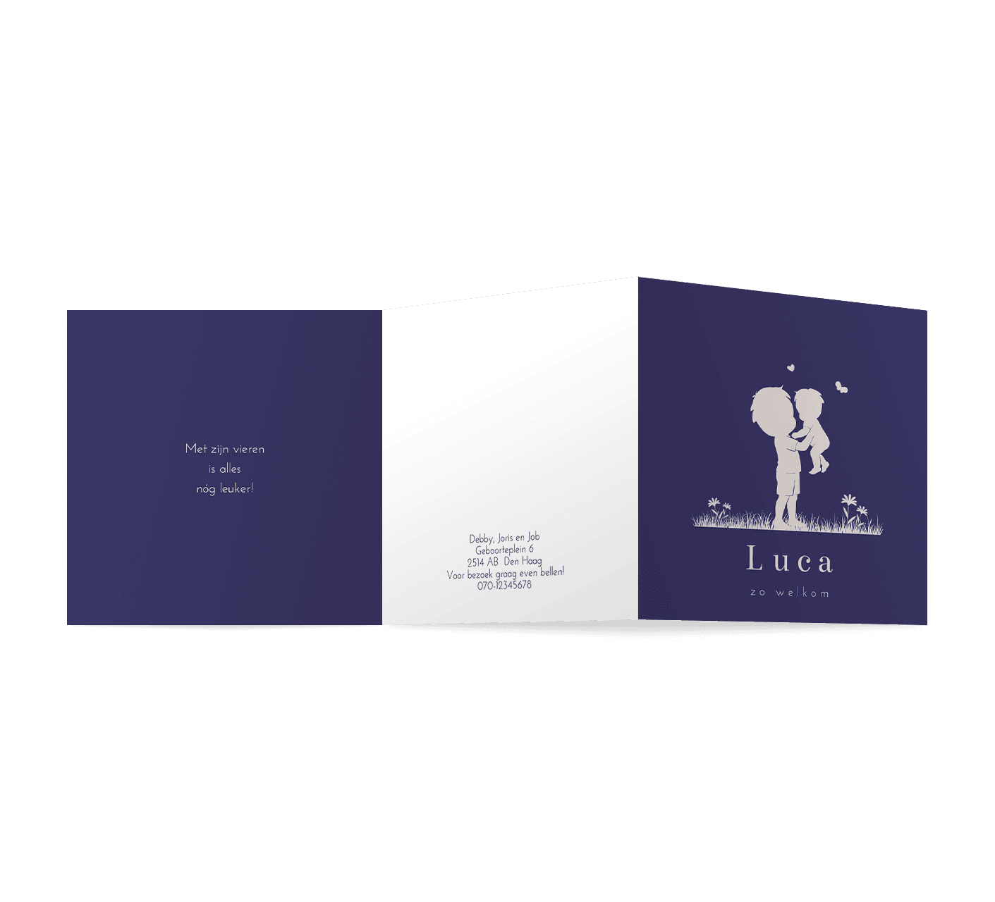 Een schattig blauw zigzag geboortekaartje voor jouw tweede kindje. Het kaartje heeft een blauwe achtergrond en illustraties van silhouetjes. Je ziet een grote broer die zijn kleine broertje optilt. Pas het ontwerp naar wens zelf aan.