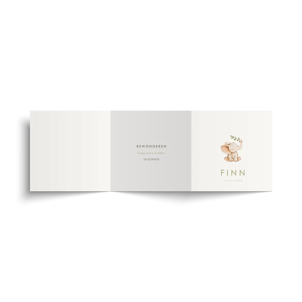 Een lief zigzag geboortekaartje voor jullie toekomstige kleintje. Het kaartje heeft een schattige illustratie van een watercolour olifantje. Het olifantje heeft een groen takje vast. Pas het ontwerp naar wens aan in onze online editor.