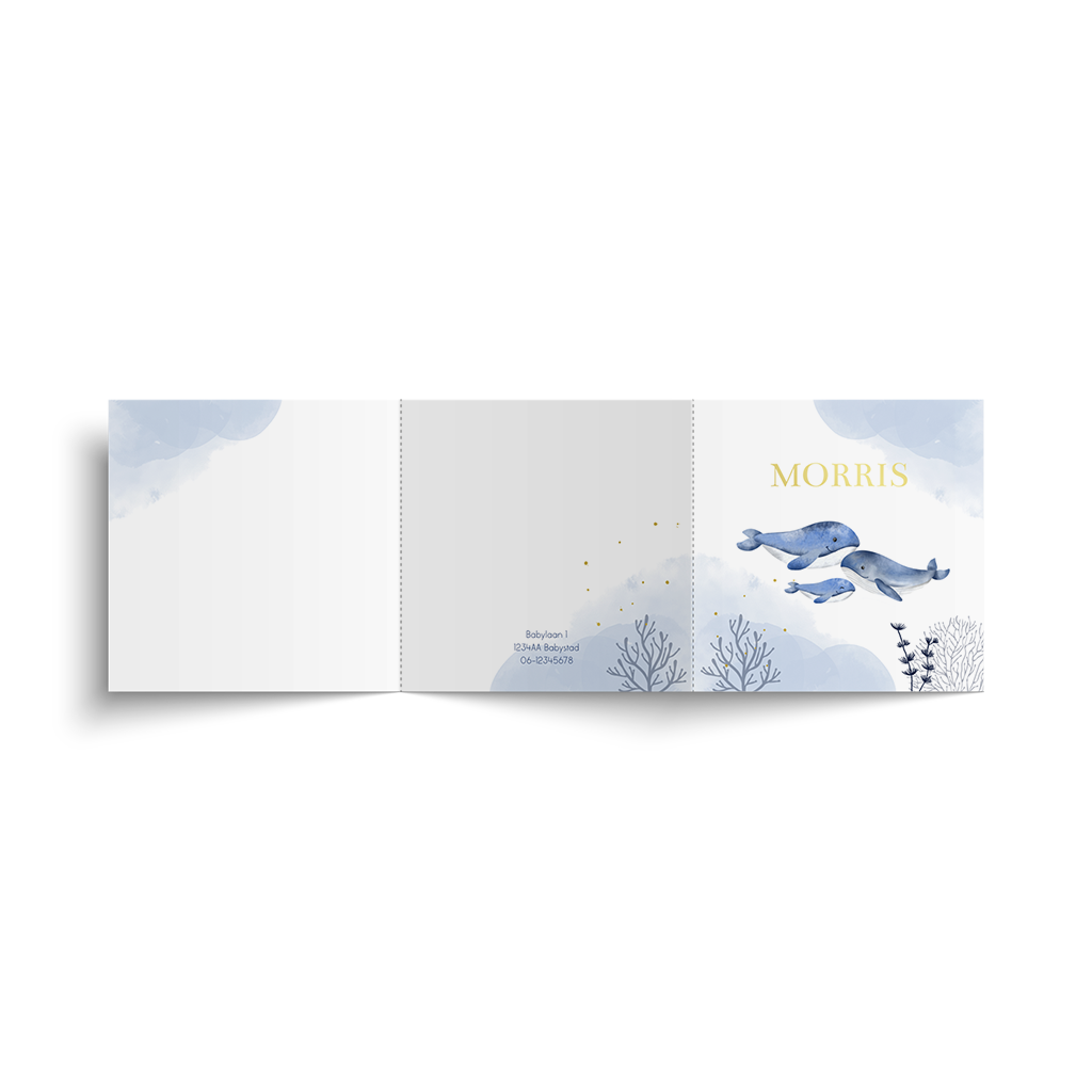 Een prachtig geboortekaartje met een walvissengezinnetje en blauwe watercolour. De naam van jullie kleine in goudfolie geeft de kaart een extra luxe uitstraling. Bewerk het ontwerp naar wens in de online editor.