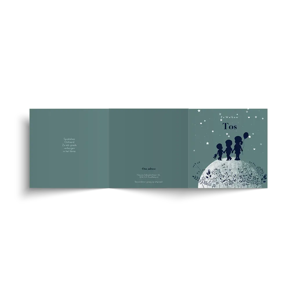Een prachtig zigzag geboortekaartje geschikt voor een zoontje met een broertje en/ of zusje. Het kaartje heeft een zigzag vorm en heeft een silhouet illustratie van drie kindjes hand in hand. Deze kaart kun je aanpassen door een silhouet te gebruiken, passend bij jouw gezinssituatie. Neem contact met ons op indien je niet het juiste silhouet bij ons kunt vinden. Pas de teksten en het lettertype naar wens aan in onze online editor.