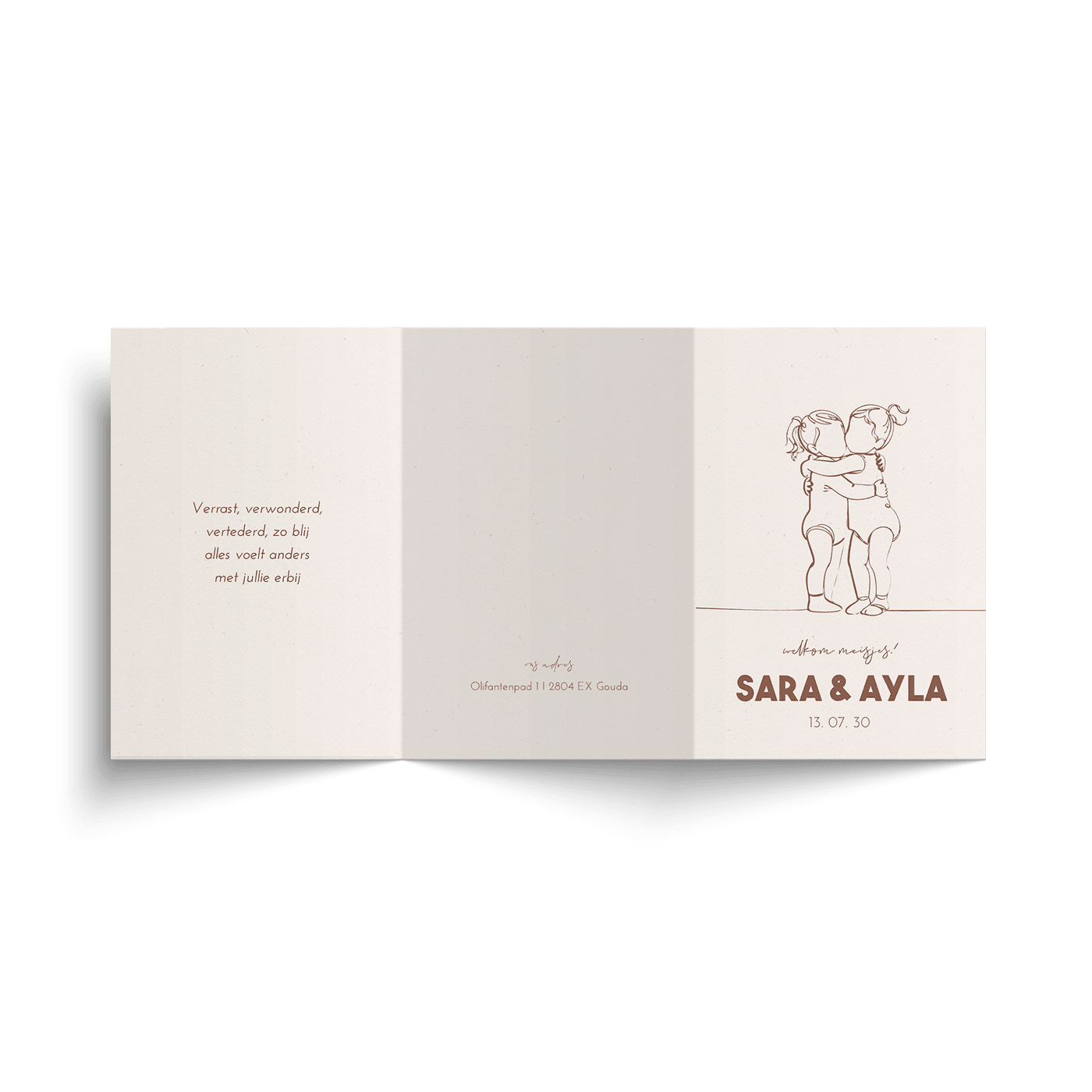 Een stijlvol en lief geboortekaartje in zigzag vorm. Het kaartje heeft een natuurlijke en stijlvolle uitstraling. Op het kaartje zie je een lijntekening van twee silhouetjes die elkaar een knuffel geven. Pas het ontwerp naar wens zelf aan.