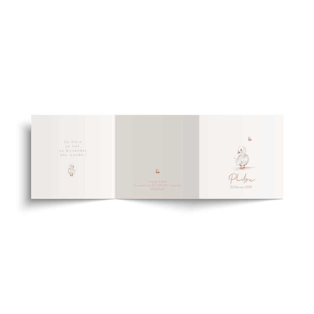 Een tof zigzag geboortekaartje voor een meisje. Het kaartje heeft meerdere vlakken met genoeg ruimte voor een foto, gedichtje en alle geboortegegevens. Op het kaartje zie je een lief eendje met vlinder. Pas het ontwerp naar wens zelf aan.