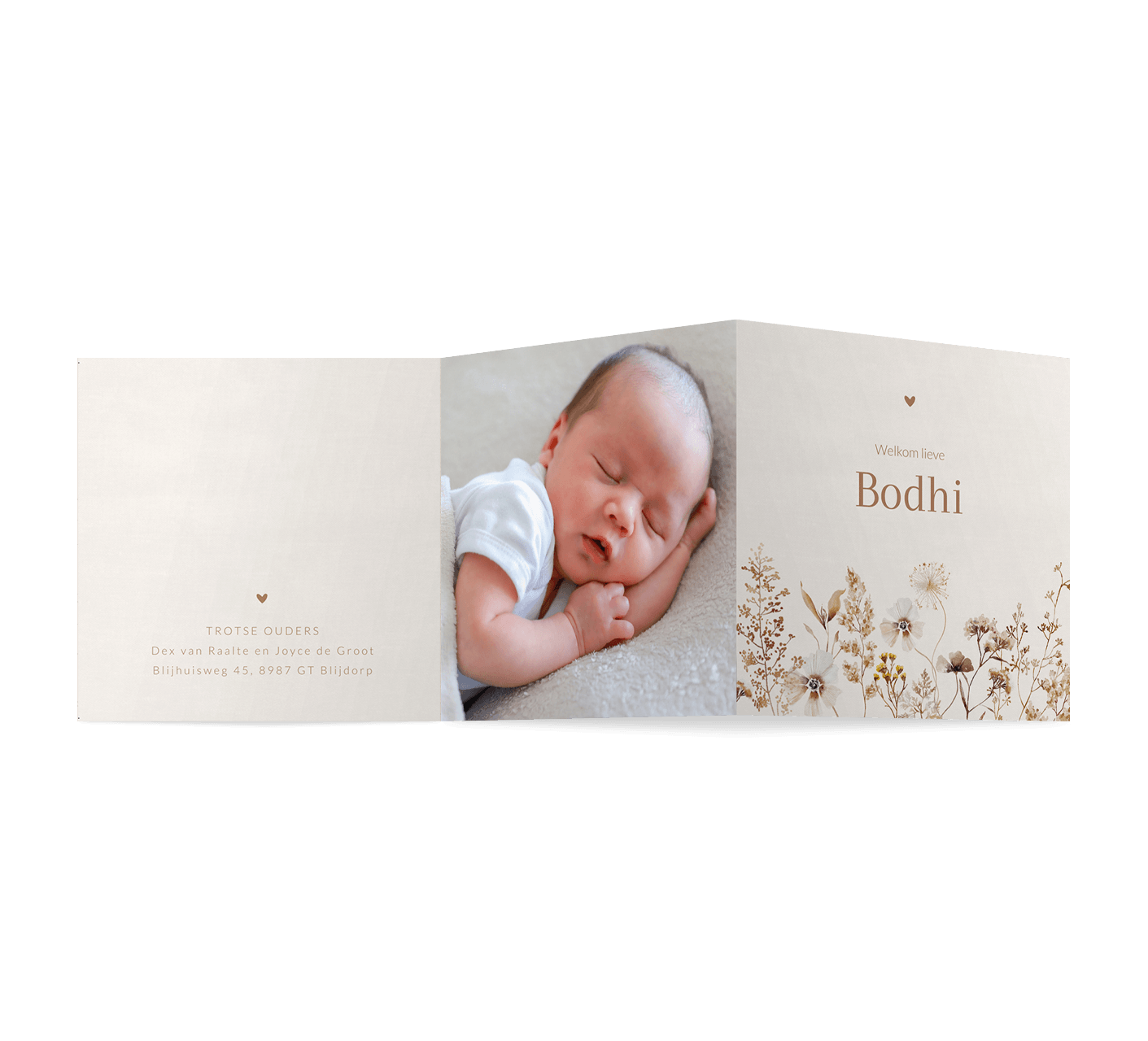 Een prachtig zigzag geboortekaartje voor jouw kindje. Het ontwerp heeft een lichte achtergrond met daarop illustraties van romantische veldbloemen. Aan de binnenkant is ruimte voor een eigen foto, de geboortegegevens en jullie gegevens. Het kaartje kan je twee keer openklappen.