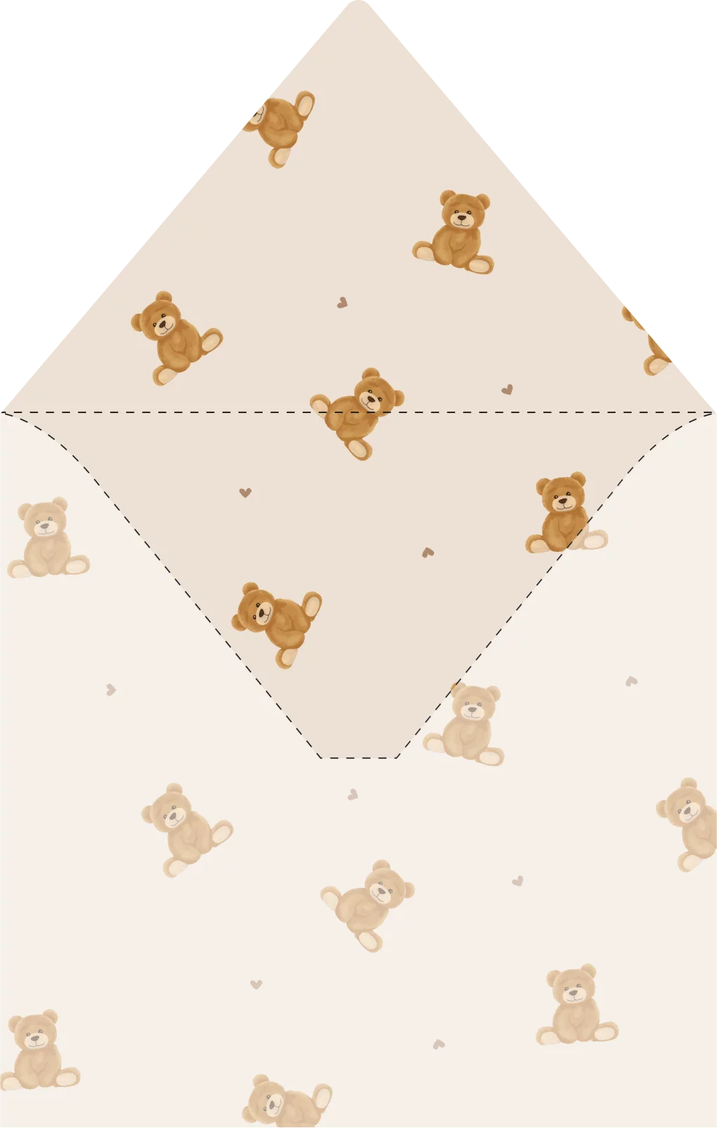 Een vrolijke beige enveloppen inlay voor jouw geboortekaartje. De inlay heeft een beige achtergrond met daarop illustraties van teddyberen. De inlay is volledig naar wens te bewerken in onze online editor en gemakkelijk zelf te plakken.