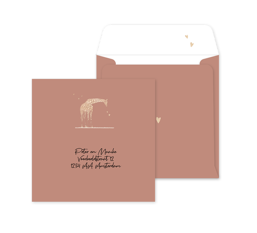 Verstuur de geboortekaartjes van jullie kleintje in deze bijpassende envelop! Deze envelop heeft een terracotta kleurige achtergrond met de goudkleurige opdruk van een giraffe, vogeltjes en hartjes.