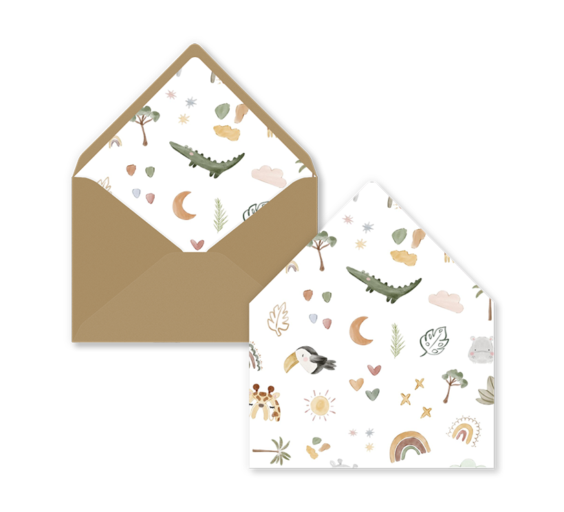 Een vrolijke envelop inlay voor jouw geboorte aankondiging. Deze inlay kan je zelf in de envelop plakken. De inlay heeft een witte achtergrond met daarop verschillende kleurrijke illustraties van onder andere dieren, hartjes en wolkjes. De inlay is naar wens aan te passen in onze online editor.