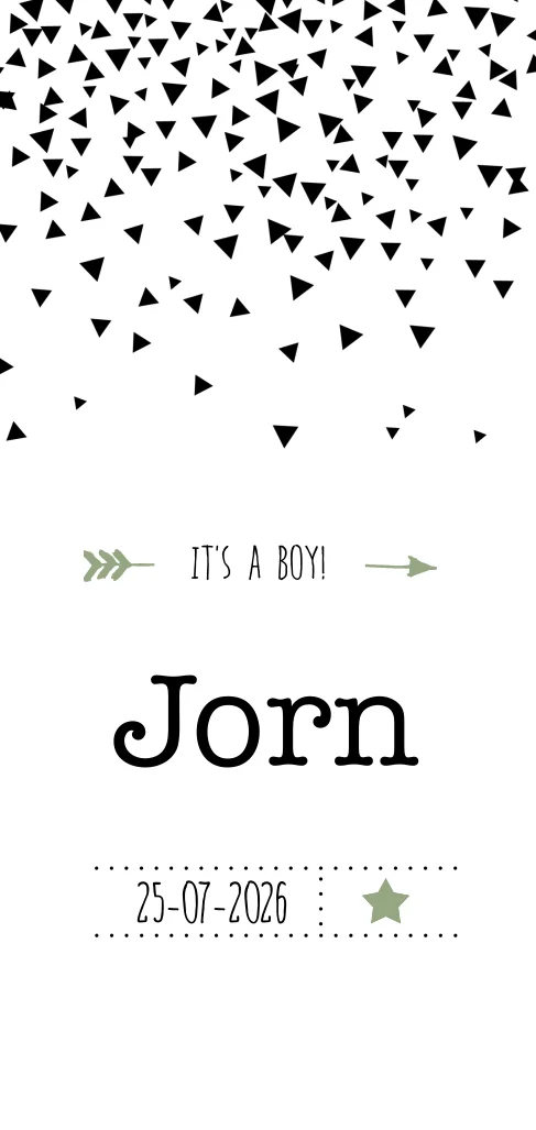 Monochrome geboortekaartje met zwart driehoekjes regen en groene illustraties. Alles is aan te passen!