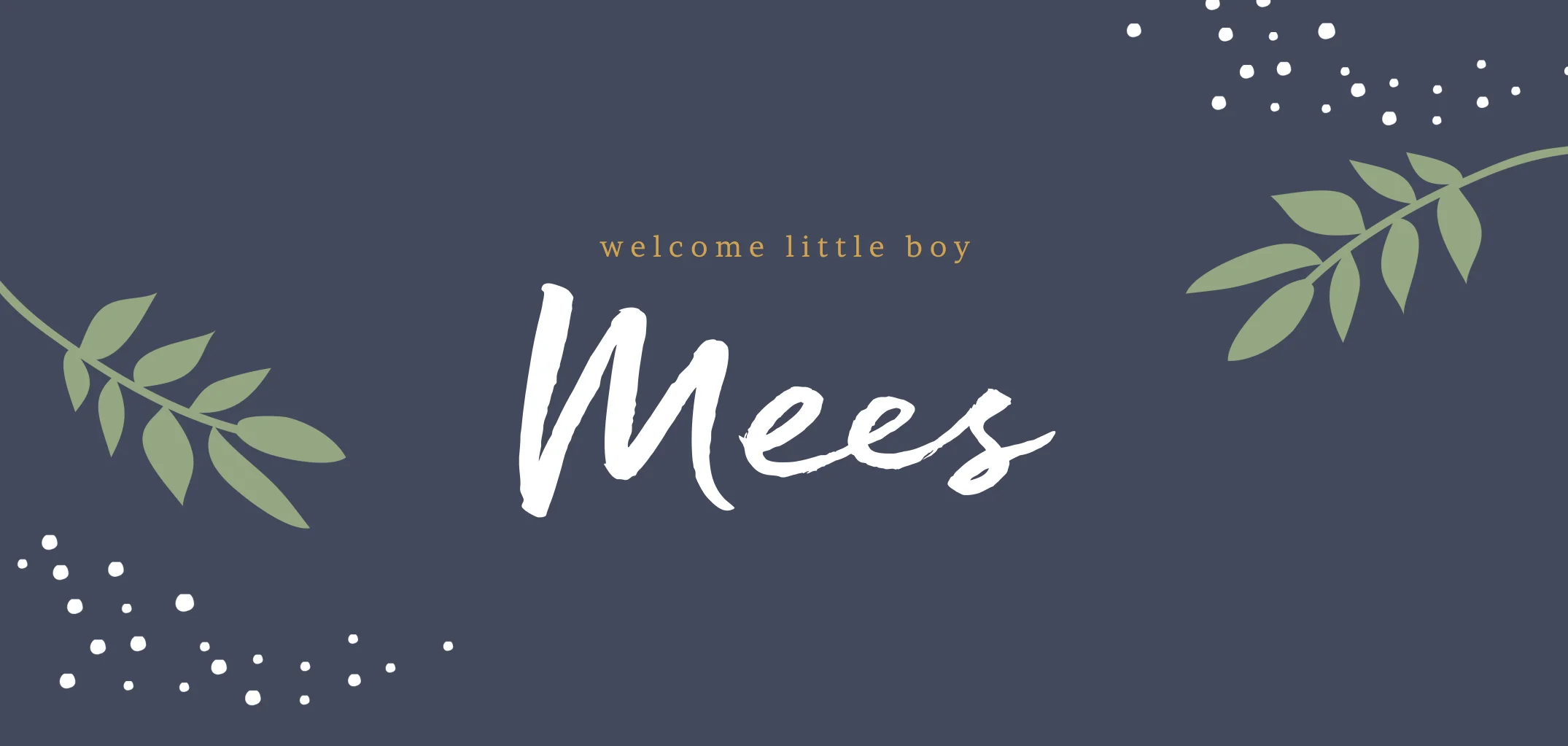 Hip panorama-geboortekaartje in donkerblauw met groene takjes en witte stipjes. Dit ontwerp van Fientje & Co heeft een moderne look. Welcome little boy!