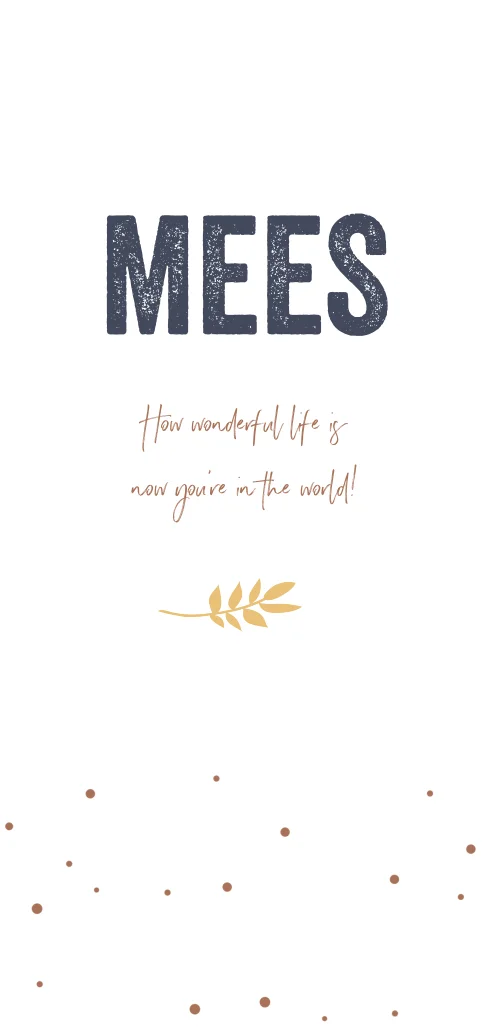 Stijlvol en hip geboortekaartje voor een jongetje met bronskleurige stipjes en een okergeel takje. Lettertypes en kleuren zijn naar wens aan te passen. How wonderful life is now you're in the world!
