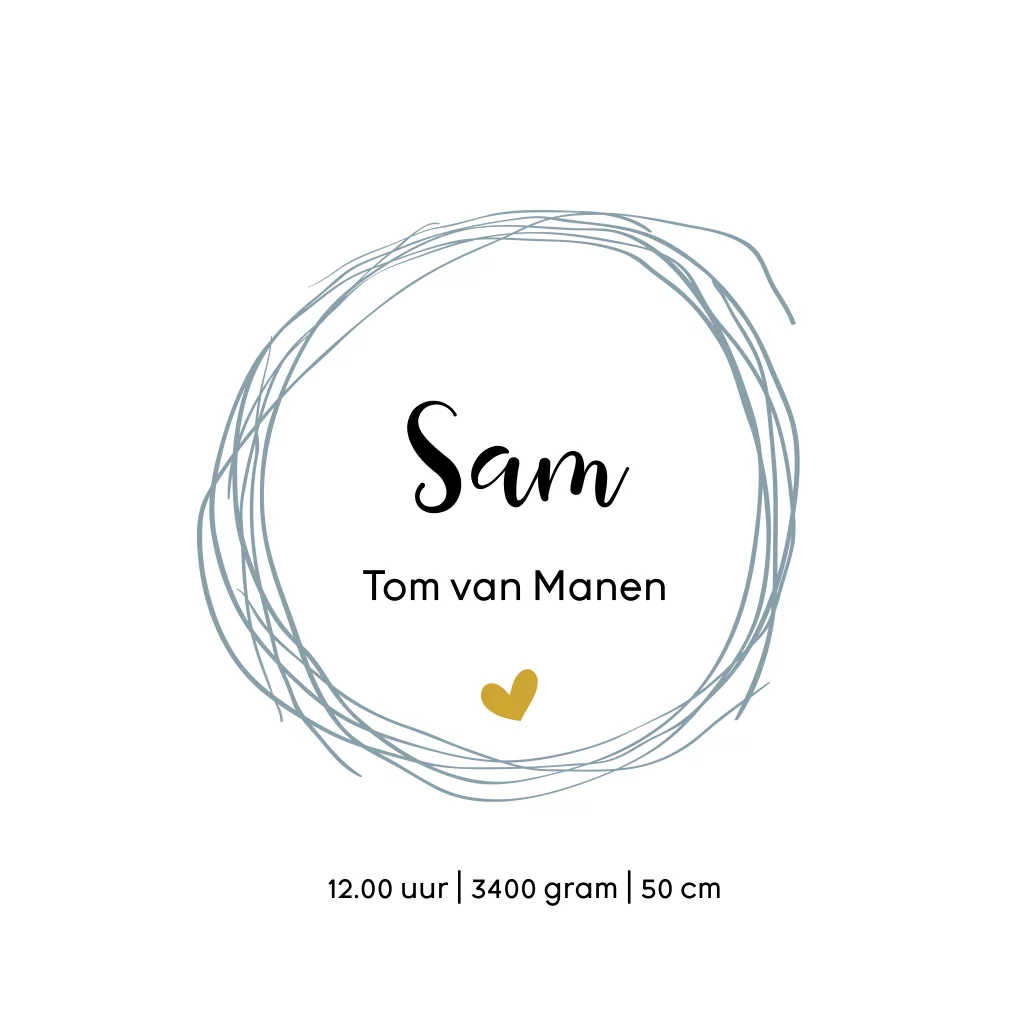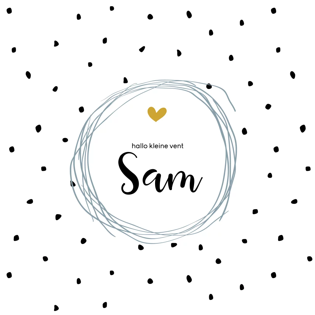 Een modern geboortekaartje voor een jongen! Dit kaartje is versierd met een stippenachtergrond, een cirkel om de naam en een hartje.