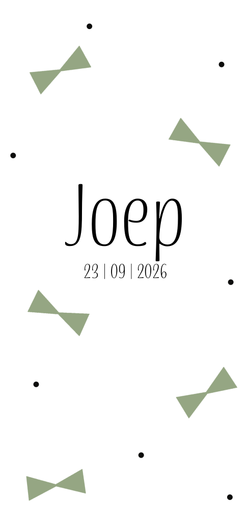 Hip geboortekaartje met groene strikjes en zwarte stipjes. Pas de groene kleur eventueel aan bij achtergrondkleur.