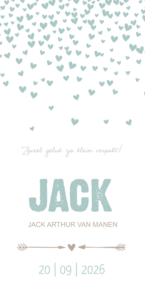 Geboortekaartje met hartjes confetti bovenaan en een stoere pijl met een hartje.