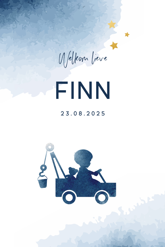 Hip geboortekaartje met silhouet van jongen in takelauto en waterverf