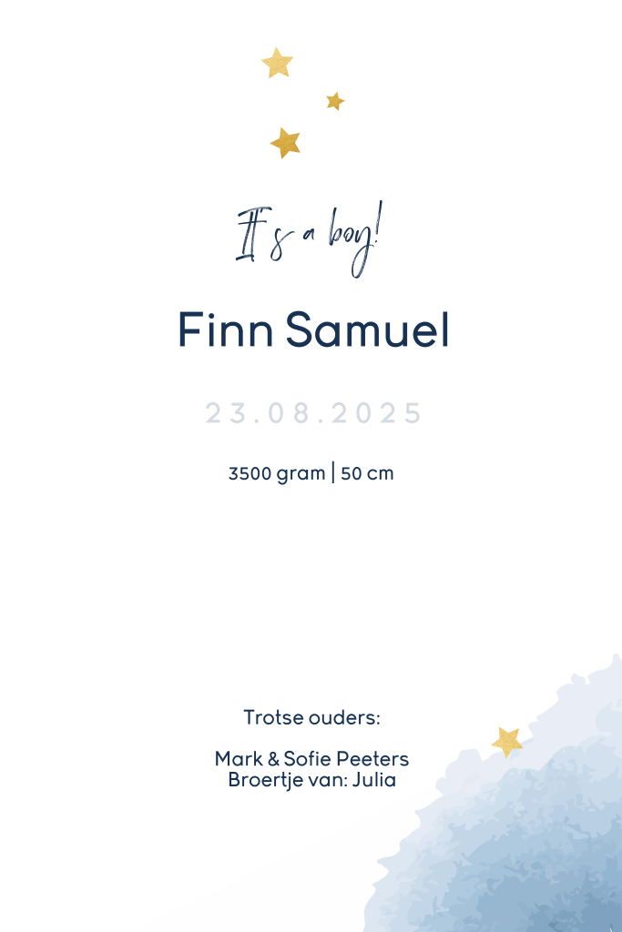 Stoer geboortekaartje voor je zoontje met een hip silhouet van een jongetje in een auto en blauwe watercolour.