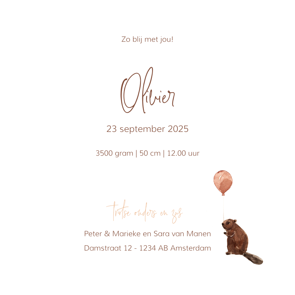 Op dit kaartje zijn verschillende bosdieren getekend. De bever heeft een ballon vast en dit maakt het kaartje extra feestelijk. Pas het kaartje naar eigen wens aan in de online editor en bestel snel een proefdruk om dit kaartje in het echt te zien!