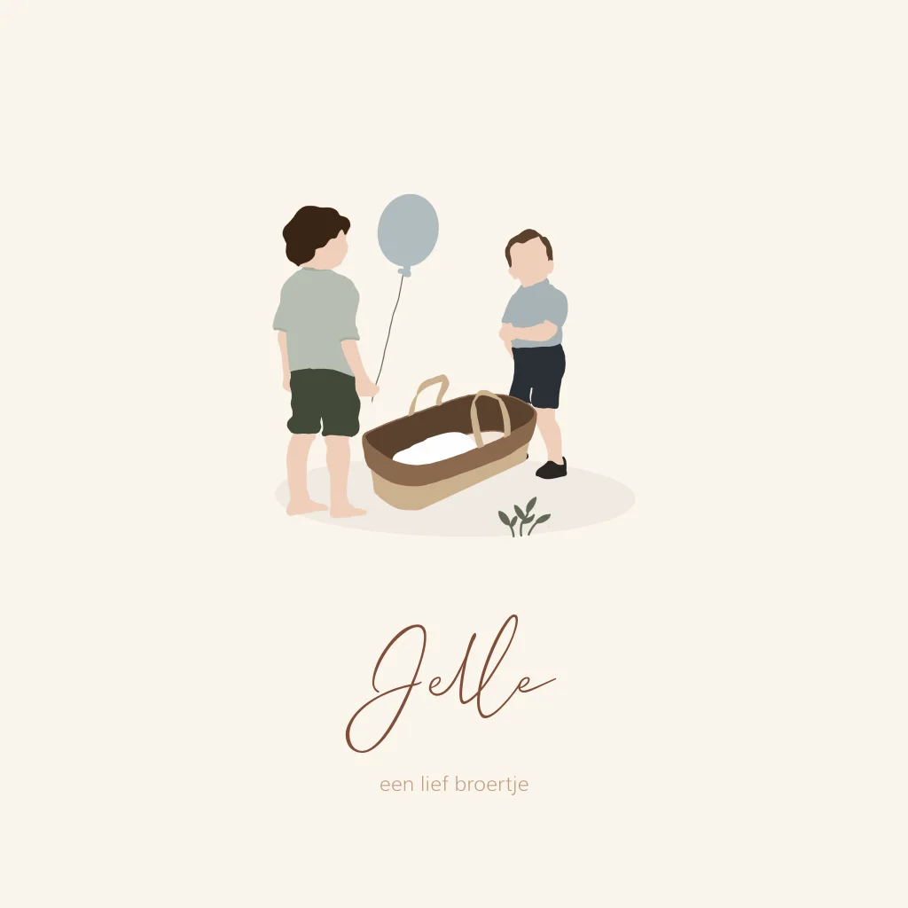 Kondig de geboorte van jullie zoon en broertje aan met dit feestelijke kaartje! Op het kaartje zijn twee grote broers naast een Mozes mandje geïllustreerd. De ballon maakt dit kaartje helemaal af. Pas het kaartje naar wens aan in onze online editor en bestel snel een proefdruk om dit kaartje in het echt te zien!