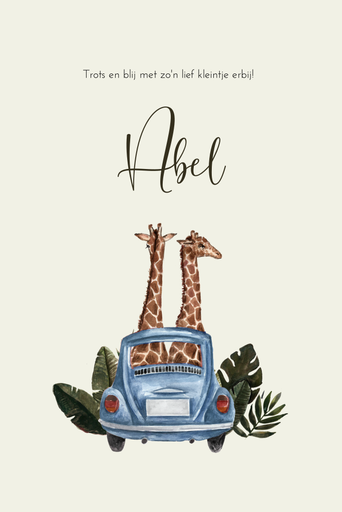 Stoere geboortekaart voor de geboorteaankondiging van je zoontje met handgetekende girafjes in een blauwe oldtimer kever met jungle bladeren.