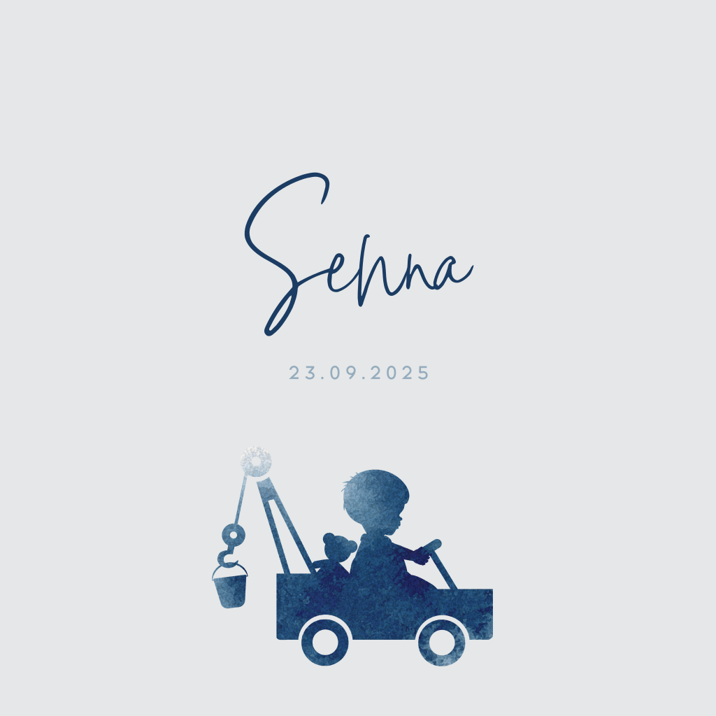 Stoer geboortekaartje voor de geboorte van je zoon met een hip blauw silhouet van een jongen met zijn teddybeer in een trapauto op een licht grijze achtergrond.