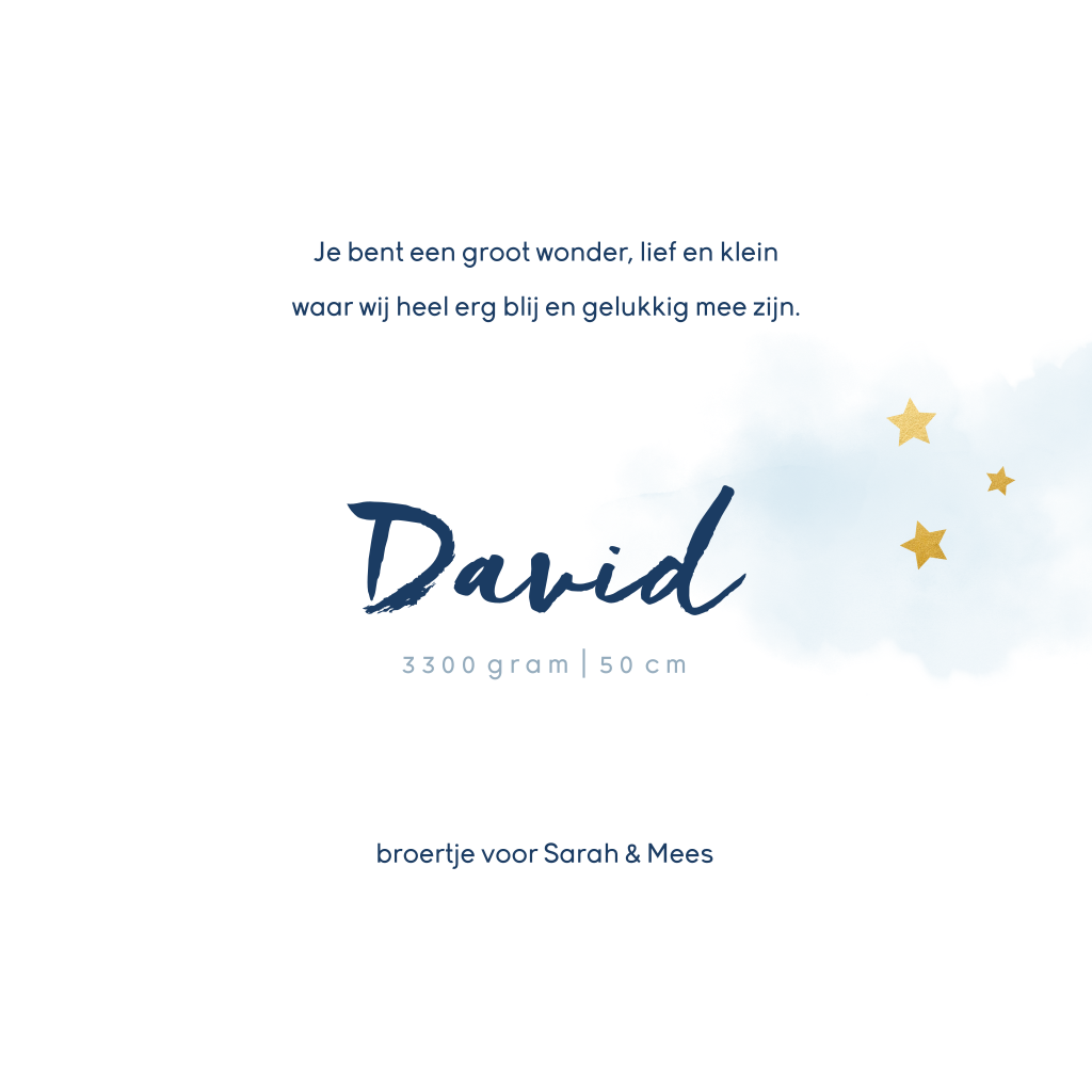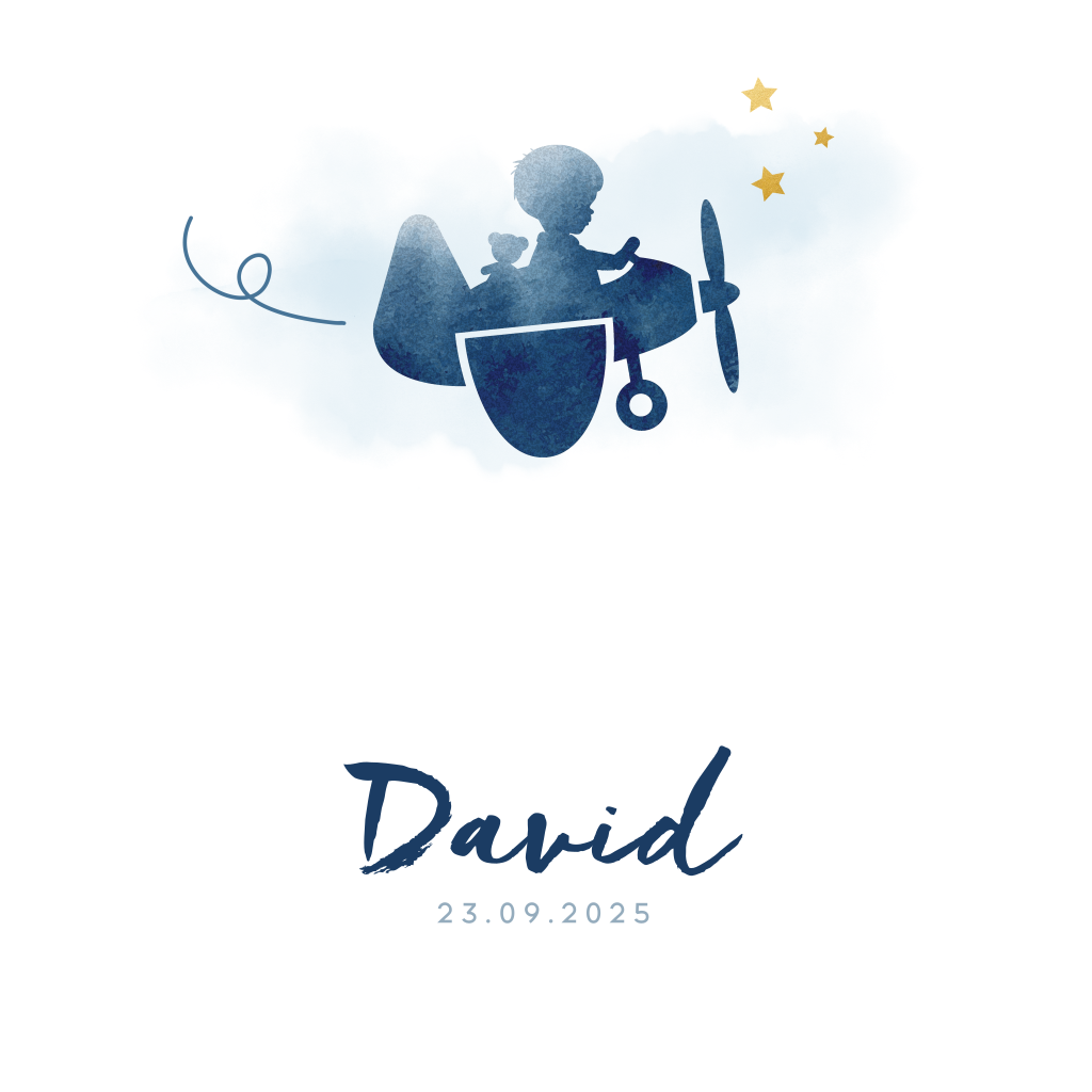 Lief geboortekaartje als geboorteaankondiging van je zoon met een blauw waterverf silhouet van een jongetje in een vliegtuig. De drie goudlook sterretjes maken dit geboortekaartje echt stoer!