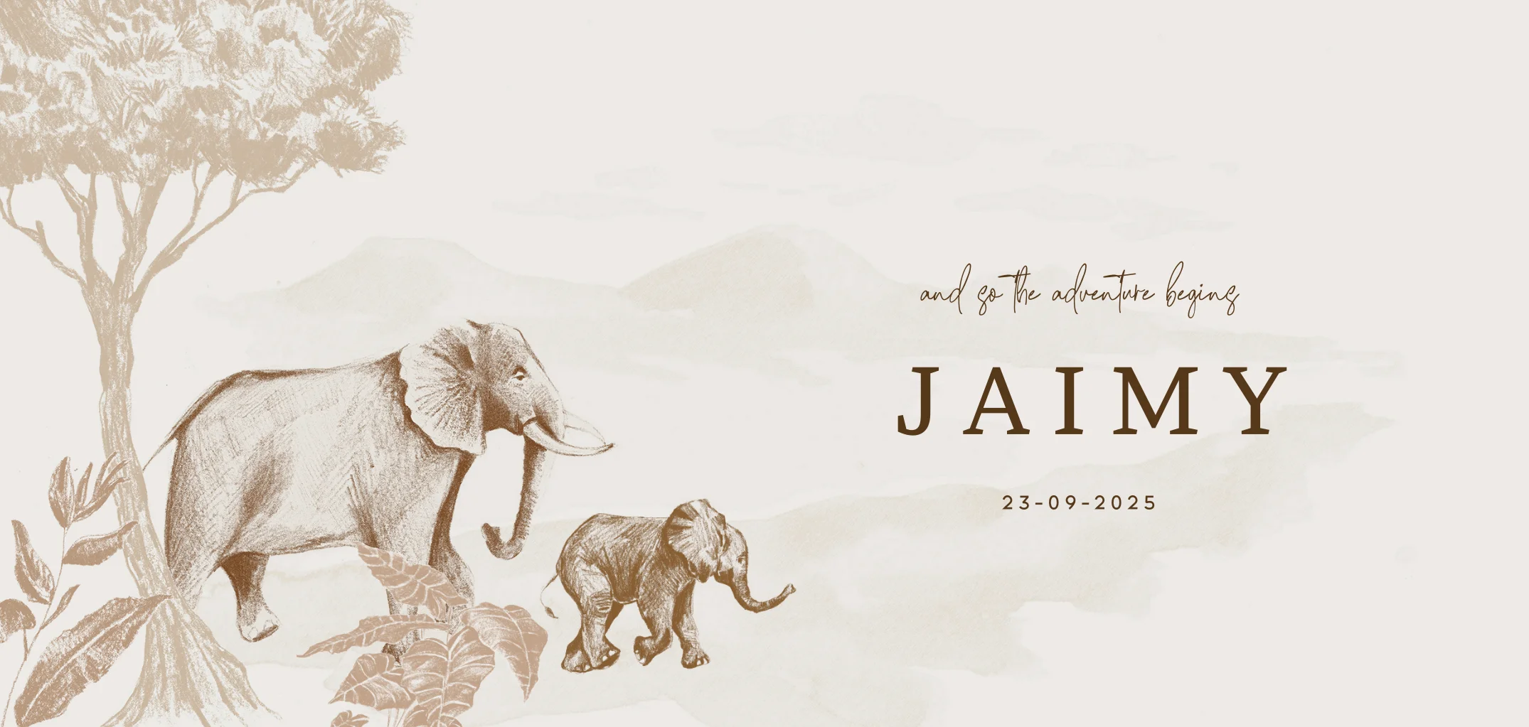 Wat een lief babykaartje voor jullie eerste kindje! Met prachtige handgetekende illustratie van een grote olifant en een klein olifantje in de jungle. Dit kaartje is leuk voor een dochter of zoon. Pas de teksten gemakkelijk aan in de online editor.