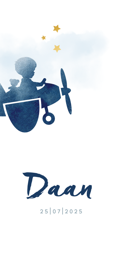 Superleuk en hip geboortekaartje voor je pasgeboren zoontje. Met een trendy silhouet van een jongen in een vliegtuigje zwevend door de wolken.