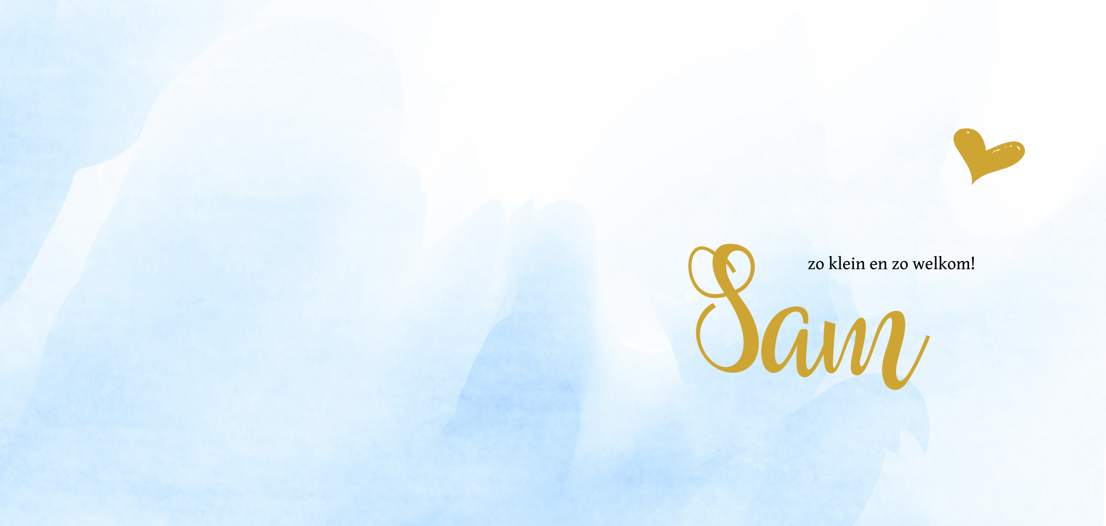 Enkel geboortekaartje voor een jongen. Speciaal aan deze kaart is de blauwe waterverf-achtergrond! De sierlijke letters en het hartje in goudlook komen hier heel mooi bij naar voren.