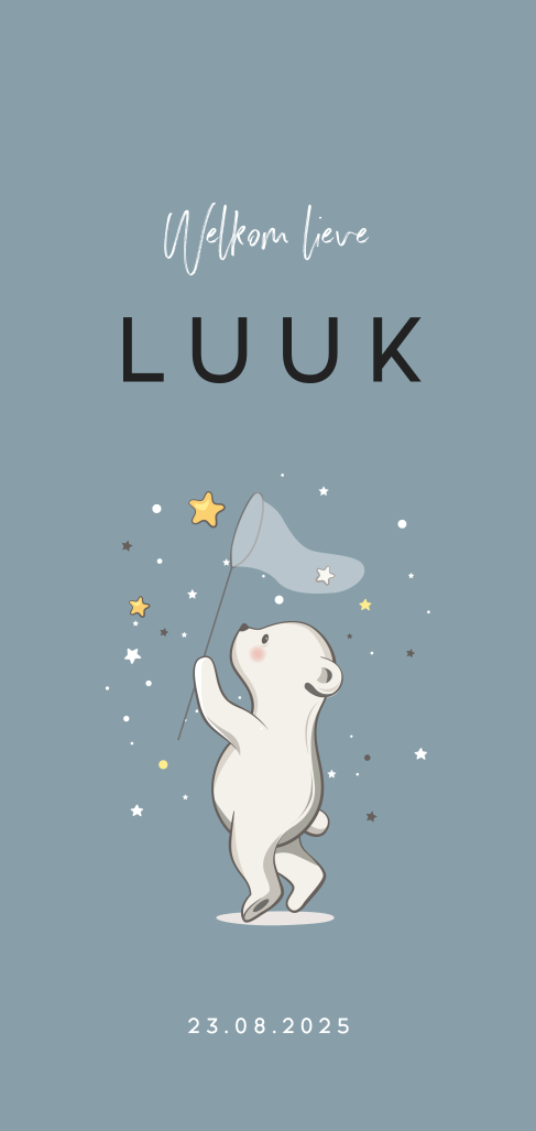 Wordt jou kindje in de winter geboren? Dan is dit schattig geboortekaartje echt wat voor jou! Dit blauwe geboortekaartje heeft een lieve illustratie van een beertje die sterretjes vangt met zijn een vangnetje.