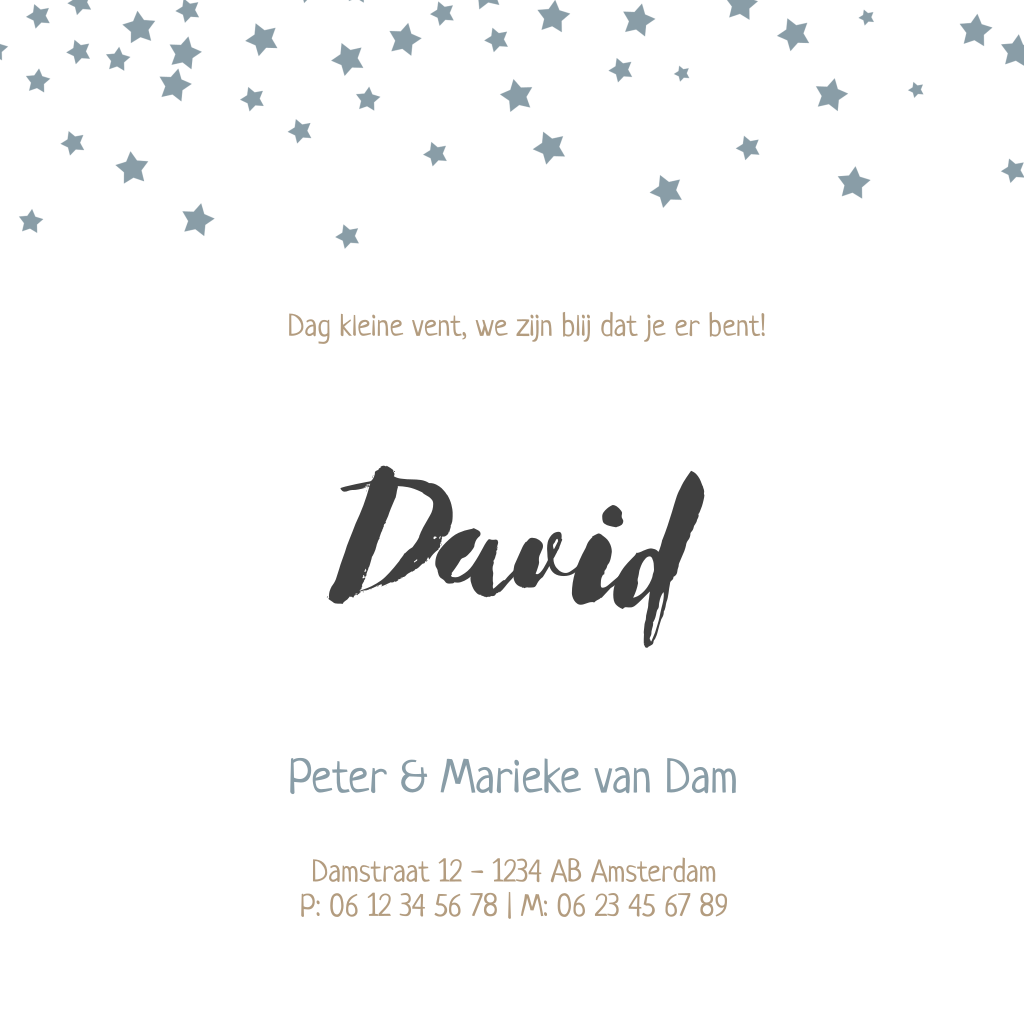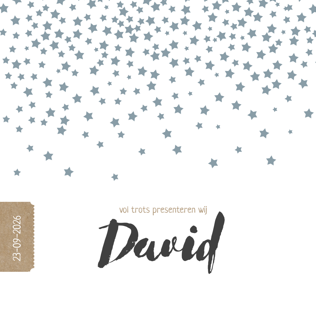 Geboortekaartje voor een jongen met blauwe sterrenregen en een kraft labeltje aan de zijkant