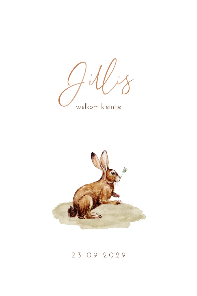 Dit is een mooi geboortekaartje voor jullie zoon of dochter. Centraal op het kaartje staat de tekening van een konijntje met een vlinder. De naam wordt gedrukt in koperfolie en geeft dit kaartje een luxe uitstraling. Het kaartje kan helemaal naar wens aangepast worden in onze online editor.