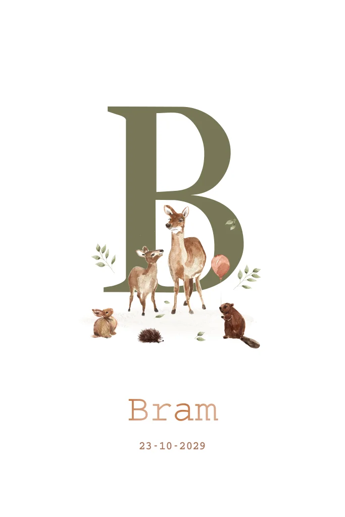 Een herfst geboortekaartje met illustraties van verschillende bosdieren. Je ziet hertjes, een konijntje, een egel en een bever. Op het kaartje zie je groot het initiaal van de naam van jullie kleintje. Deze kan je zelf gemakkelijk aanpassen in onze online editor.