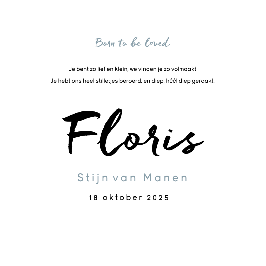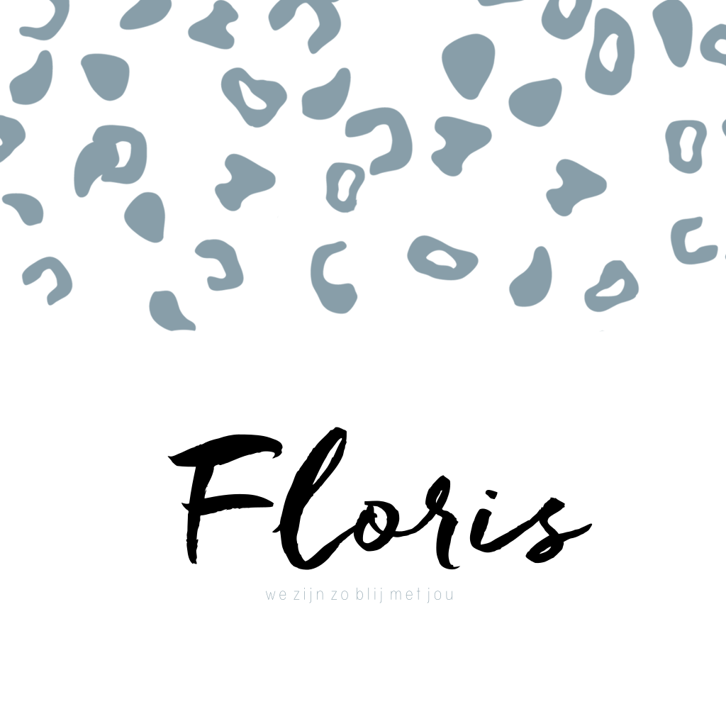 Supertrendy geboortekaartje met blauwe panterprint en een hip lettertype. Leuk voor een een stoere zoon! Teksten en lettertypes pas je eenvoudig aan.