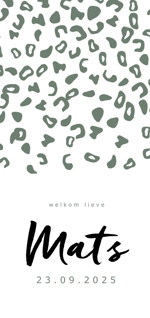 Luipaardprint is zó trendy en stoer! De legergroene kleur komt mooi uit op de witte achtergrond en in combinatie met het vlotte, zwarte lettertype is dit kaartje helemaal compleet! Hoe heet jouw kleine jongen?