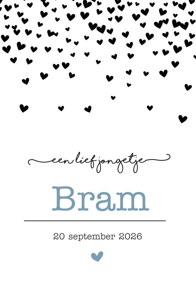 Enkel geboortekaartje met bovenaan zwarte hartjesregen en een leuke speelse tekst