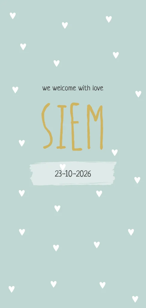 Jongens geboortekaartje met een blauwgroene achtergrond en witte hartjes. Met een banner voor geboortedatum. Dit langwerpige formaat is helemaal hip!