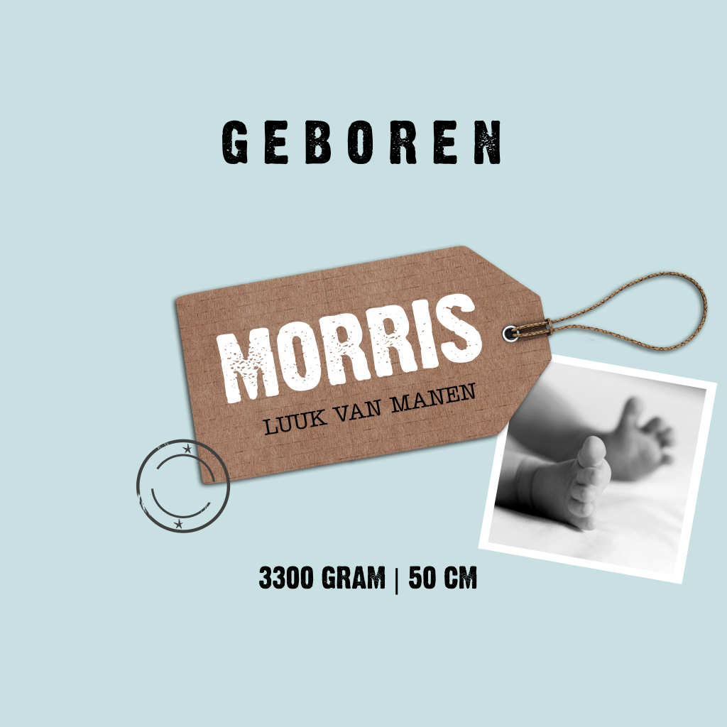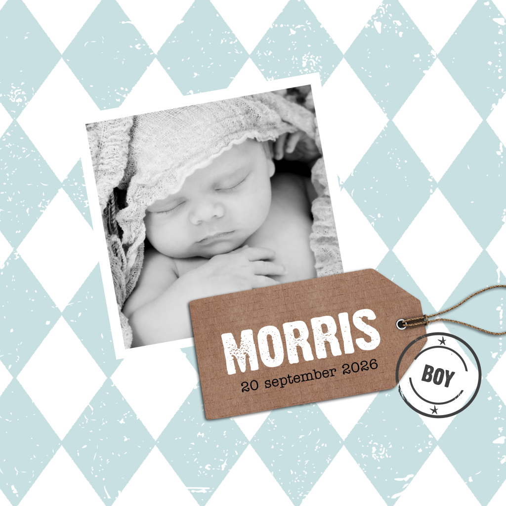 Geboortekaartje voor een jongen met vintage blauwe wiebers en een kraft label met een stempel. Kan ook zonder foto