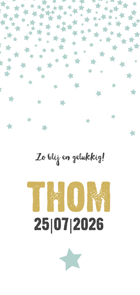 Geboortekaart met blauwe sterrenregen in combinatie met okergoud en zwarte teksten.
