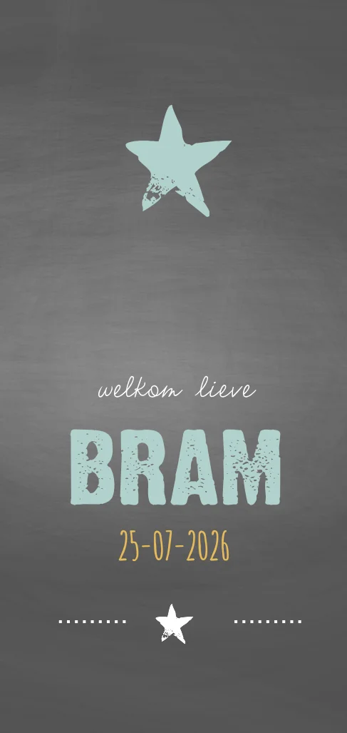 Dit stoere babykaartje is extra leuk door het hippe langwerpige formaat. De trend voor geboortekaartjes jongen van dit moment! Maak dit geboortekaartje persoonlijk door zelf de kleuren van de teksten en ster aan te passen.