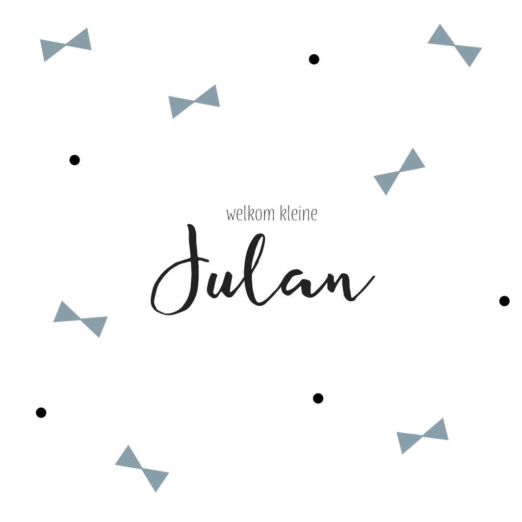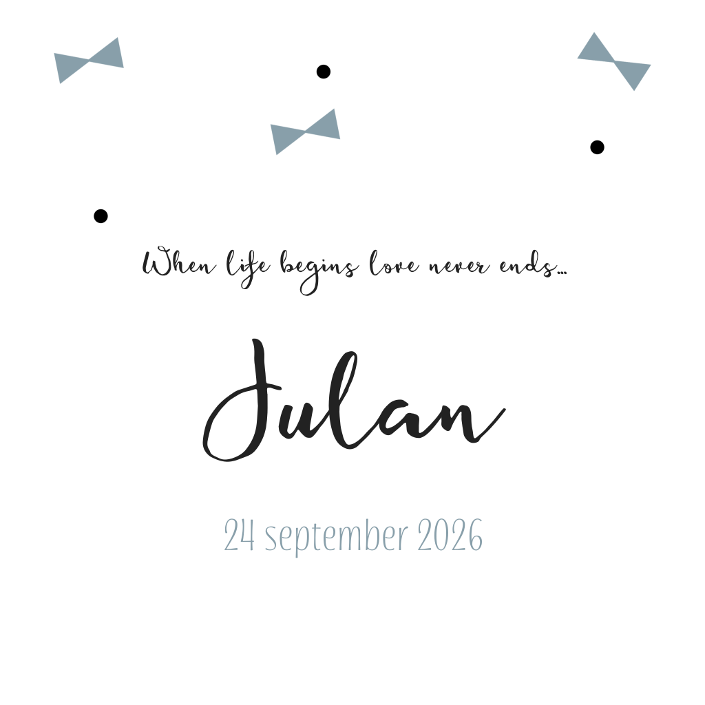 Geboortekaartje met zwarte stipjes en grijsblauwe strikjes. De kleur van de strikjes pas je zelf gemakkelijk aan.