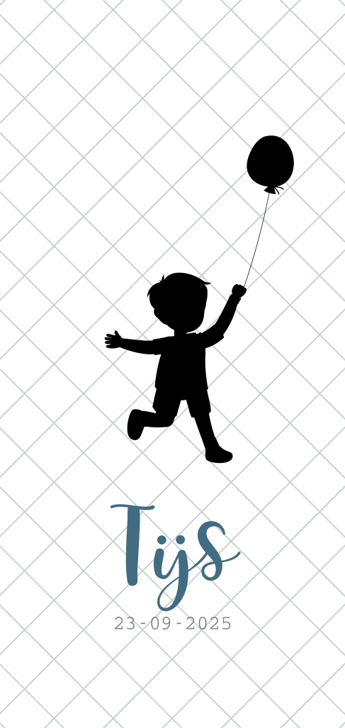 Origineel en trendy geboortekaartje met achtergrond van ruitjes en een zwart silhouet van een jongen met ballon.