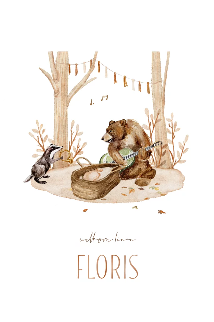 Wat is dit een prachtig geboortekaartje! Op het kaartje is een feestelijk tafereel te zien. Midden in het bos zijn een wasbeer en beer instrumenten aan het bespelen voor de baby in het wiegje. De naam wordt gedrukt in hoogglans en geeft dit kaartje een luxe uitstraling. Het kaartje kan helemaal naar wens worden aangepast in onze online editor.
