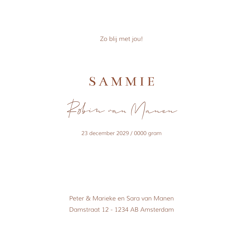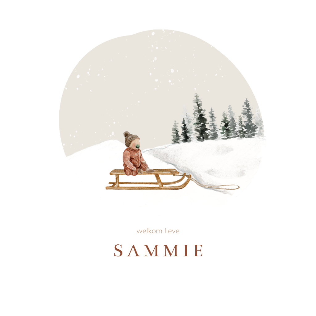 Een winters geboortekaartje met lieve illustratie. Op het kaartje zie je een kindje op de slee zitten in de sneeuw. Pas in onze online editor het kaartje aan en bestel een proefdruk om het kaartje in het echt te bewonderen.