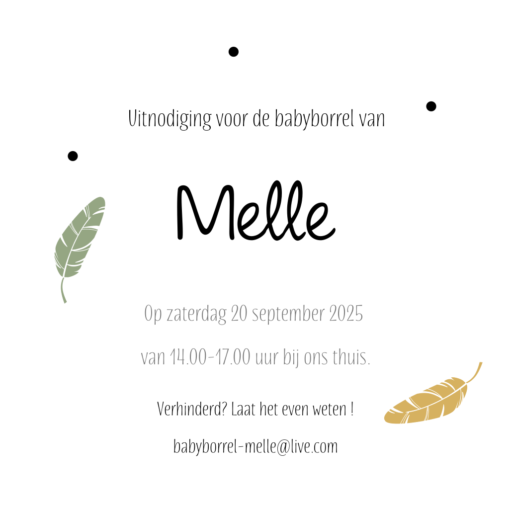 Kraamborrelkaartje met gele en groene veertjes en kleine zwarte stipjes. Past bij de veertjes geboortekaartjes uit onze collectie.