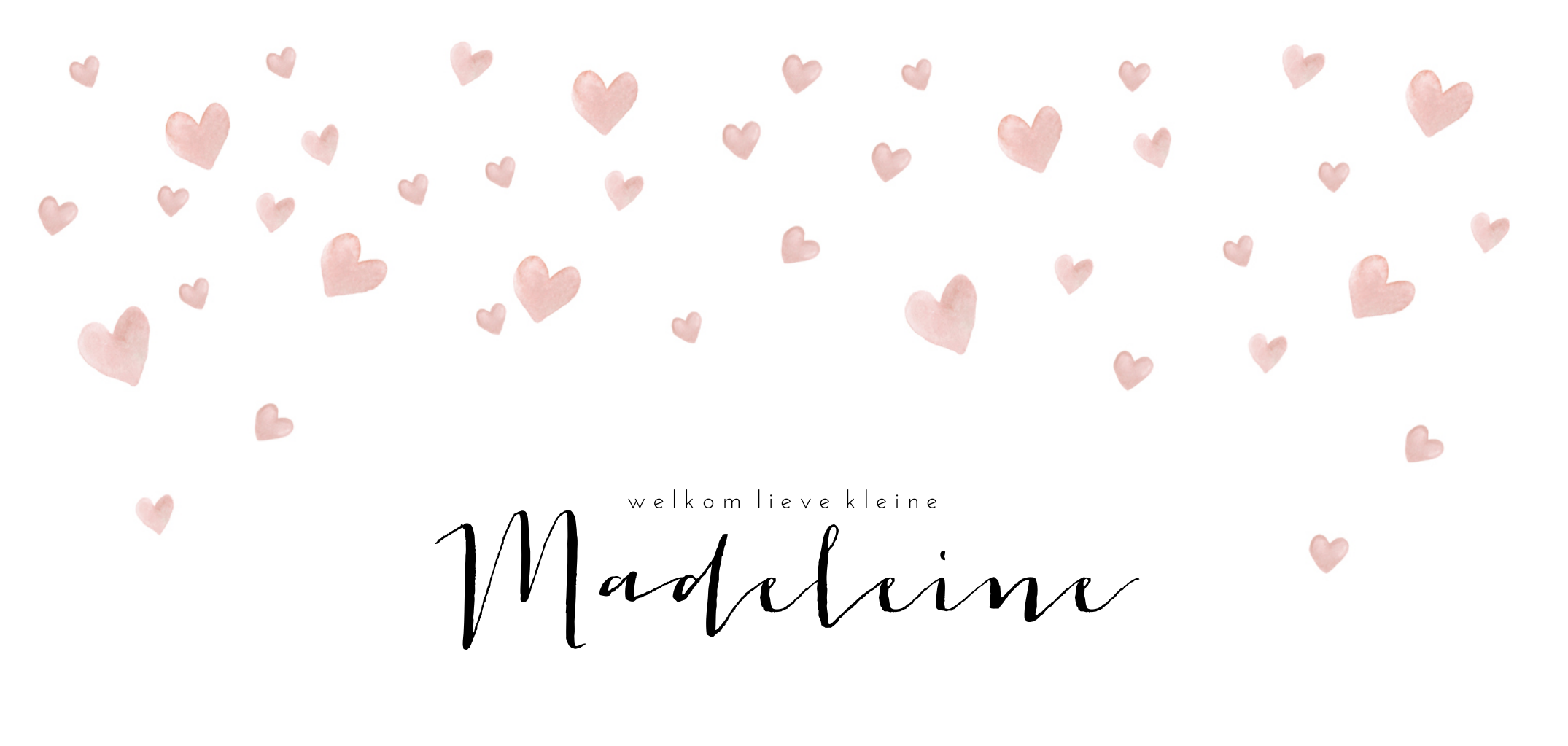 Lief geboortekaartje voor een meisje met roze waterverf hartjes verdeeld over de kaart. De hartjesregen is helemaal hip op dit moment! Leuk met een bijpassende kleur envelop en sluitzegel!