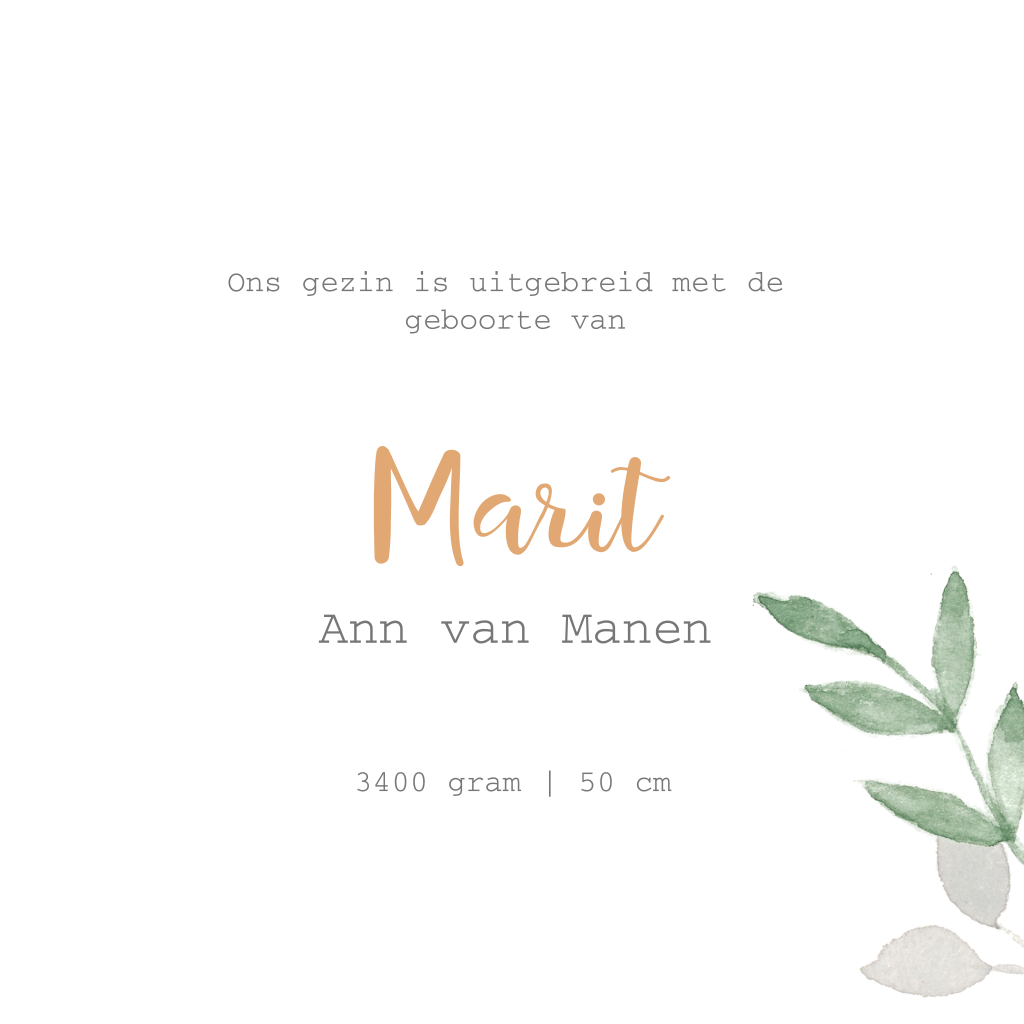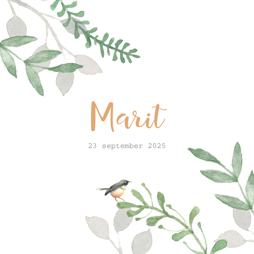 Lief geboortekaartje voor een meisje met groene watercolour takjes en een klein vogeltje. Pas kleuren en lettertypen naar wens aan in de editor.