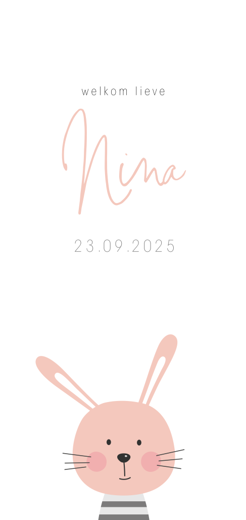 Wat een lief geboortekaartje is dit! Onderaan een illustratie van een roze haasje met een gestreept truitje. Dit ontwerp van Fientje & Co is leuk voor een meisje! Teksten en lettertypes pas je naar wens aan.