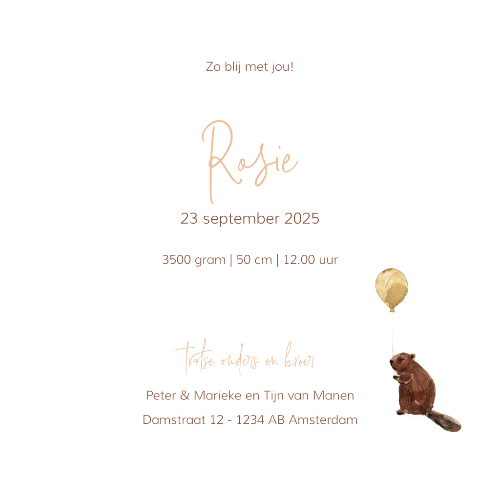 Op dit schattige kaartje voor jullie pasgeboren dochtertje staan de tekeningen van een hert, bever, konijn en egel. Pas het kaartje naar wens aan in de online editor en bestel een proefdruk om dit kaartje in het echt te zien!