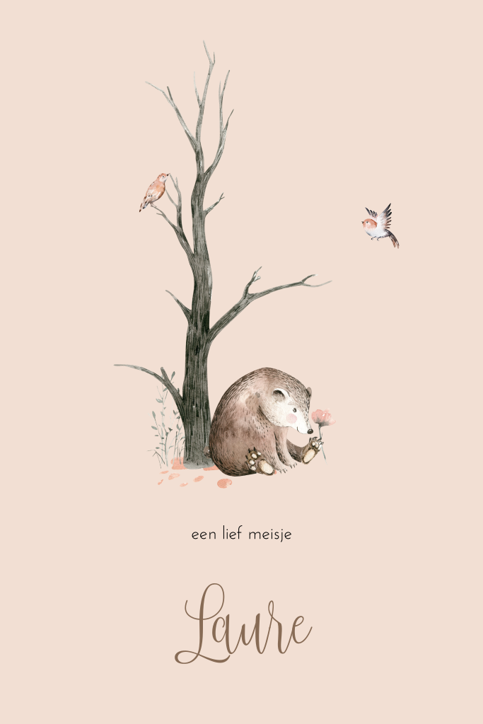 Lief geboortekaartje voor meisje met illustratie van beer bij boom